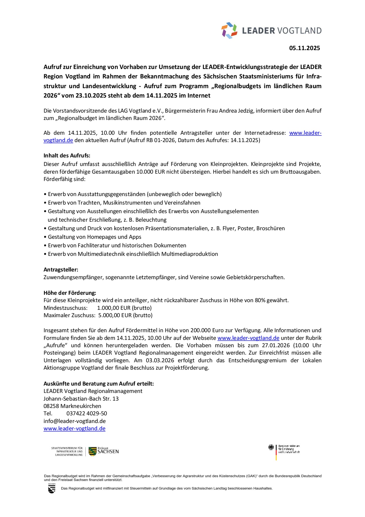 Aufruf zur Einreichung von Vorhaben zur Umsetzung der LEADER-Entwicklungsstrategie der LEADER Region Vogtland