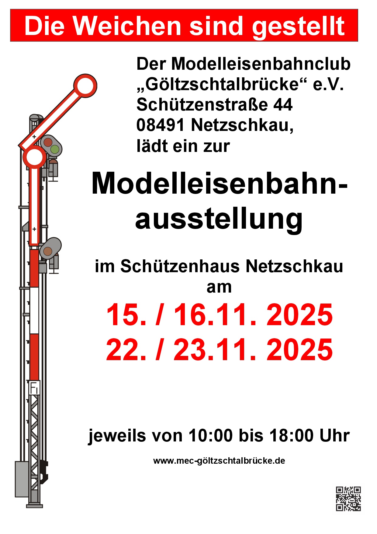 Der Modelleisenbahnclub „Göltzschtalbrücke“ e. V. lädt wieder ein zur beliebten Modelleisenbahnausstellung im Schützenhaus Netzschkau.