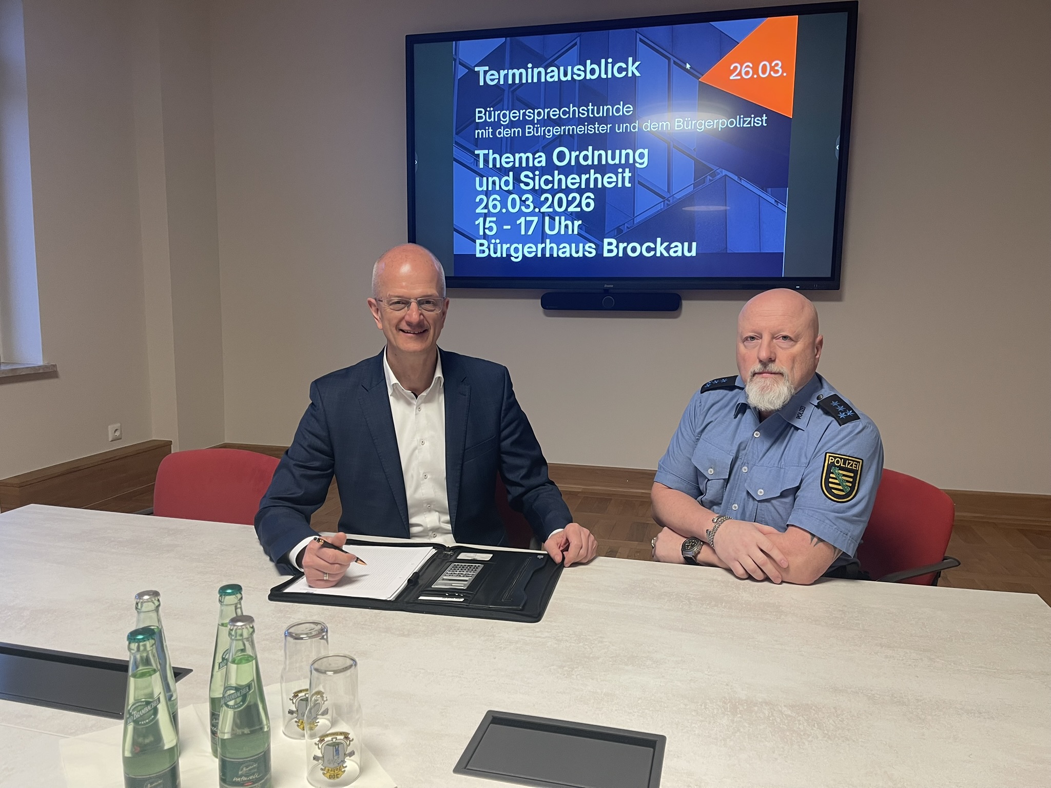 Bürgermeister Mike Purfürst und Bürgerpolizist Rico Ehlert begrüßen Sie