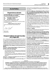Netzschkauer Stadtanzeiger Nummer 9 3 Samstag, 19. September 2015 Antrag auf eine Garagenausfahrt für das Grundstück Martin-Lu- Aus dem Rathaus ther-Straße 1 auf den städtischen Parkplatz „An der Schlossstraße“ zuzustimmen. SR 48/2015 – Billigungs- und Auslegungsbeschluss, 4. Entwurf des – Vorhabenbezogenen Bebauungsplanes „Neubau eines Bürgermeistersprechstunde Altenpflegeheimes“ in Netzschkau, Brockauer Straße – Pla- nungsstand August 2015 Sehr geehrte Mitbürgerinnen und Mitbürger von Netzsch- kau und den dazugehörigen Ortsteilen, Der Stadtrat der Stadt Netzschkau billigt den 4. Entwurf des – Vor- die nächste Bürgermeistersprechstunde findet habenbezogenen Bebauungsplanes „Neubau eines Altenpflege- am Donnerstag, 8. Oktober 2015, heimes“ in Netzschkau, Brockauer Straße – Planungsstand August von 13.00 Uhr bis 17.00 Uhr 2015 einstimmig und beschließt gem. § 3 Abs. 2 BauGB i.V.m. § 4a Abs. 3 BauGB die öffentliche Auslegung für die Dauer von im Büro des Bürgermeisters (1. OG) im Rathaus, Markt 12 in Netzschkau, statt. 2 Wochen. Die zu beteiligenden Träger öffentlicher Belange sind von der Auslegung zu benachrichtigen. Die Auslegung ist nach Zur Vorbereitung und um Wartezeiten zu vermeiden, melden § 3 Abs. 2 Satz 2 ortsüblich bekannt zu machen. Gleichzeitig mit Sie sich bitte unter der der Öffentlichkeitsbeteiligung ist eine Beteiligung der Behörden Telefonnummer: 0 37 65 / 39 01 10 kurz an und nennen den Anlass Ihres Besuches. und sonstiger Träger öffentlicher Belange nach § 4 Abs. 2 BauGB durchzuführen. Ihr Der Bürgermeister wird beauftragt, die öffentliche Bekanntma- chung im Stadtanzeiger zu veranlassen. SR 49/2015 – Spenden Der Stadtrat der Stadt Netzschkau bevollmächtigt den Bürgermeis- ter mehrheitlich zur Annahme einer Sachspende. Mike Purfürst SR 50/2015 – Aufhebung des Beschlusses SR 44/2015 Sachein- Bürgermeister lage in die Wohnungsbau- und Entwicklungsgesellschaft mbH Der Stadtrat der Stadt Netzschkau beschließt einstimmig die Auf- hebung des Beschlusses 44/2015 auf Grund eines Schreibfehlers Sitzung des Stadtrates der Stadt Netzschkau in der Beschlussvorlage und der Beschlussfassung. am 25. August 2015 SR 51/2015 – Aufhebung des Beschlusses SR 45/2015 Sat- zungsänderung der Wohnungsbau- und Entwicklungsgesell- Die 15. Sitzung des Stadtrates der Stadt Netzschkau fand am schaft Netzschkau mbH 25. August 2015 im Sitzungssaal der Stadt Netzschkau statt. Bür- Der Stadtrat der Stadt Netzschkau beschließt einstimmig die Auf- germeister Mike Purfürst eröffnete die Sitzung und stellte die ord- hebung des Beschlusses 45/2015 auf Grund eines Schreibfehlers nungsgemäße Ladung fest. Die Tagesordnung wurde seitens der in der Beschlussvorlage und der Beschlussfassung. Stadträte bestätigt. Der Bürgermeister gab die vorliegenden Ent- SR 52/2015 – Sacheinlage in die Wohnungsbau- und Entwick- schuldigungen bekannt. Die Beschlussfähigkeit wurde festgestellt. lungsgesellschaft Netzschkau mbH Im öffentlichen Teil der Sitzung wurden folgende Beschlüsse Der Stadtrat der Stadt Netzschkau beschließt einstimmig die gefasst: Grundstücke 519k, 519/2, 519/3, 731/1, 731/2, 723, 732, 724, 733, SR 46/2015 – Fortschreibung Integriertes Stadtentwicklungs- 725, 734/1, 734/2, 725a, 736/1, 736/2 aus dem Grundbuchblatt konzept um das Fachkonzept Brachen 1597 der Stadt Netzschkau von insgesamt 16.940 m² zum BRW von Der Stadtrat beschließt einstimmig: 26,00 €/m² = 440.440 € in das Vermögen seiner 100%igen Toch- - das Fachkonzept Brachen als Ergänzung zum bestehenden ter, der Wohnungsbau- und Entwicklungsgesellschaft Netzschkau gesamtstädtischen integrierten Stadtentwicklungskonzept mbh, Markt 12, 08491 Netzschkau, als Sacheinlage zu übertragen. (InSEK) der Stadt Netzschkau Im Vermögen der Gesellschaft dient die Sacheinlage der Erhöhung - die Eintragung der im Fachkonzept aufgeführten Brachen des Stammkapitales um 1.000,00 €. Die verbleibende Differenz in das digitale Brachflächenkataster des Freistaates Sachsen wird in die Kapitalrücklage der Gesellschaft eingestellt. (KWIS.net) SR 53/2015 – Satzungsänderung der Wohnungsbau- und Ent- SR 47/2015 – Antrag einer Garagenausfahrt auf städtischen wicklungsgesellschaft Netzschkau mbH Parkplatz „An der Schlossstraße“ Der Stadtrat der Stadt Netzschkau beschließt einstimmig, die Der Stadtrat der Stadt Netzschkau beschließt einstimmig, dem Erhöhung des Stammkapitales der Wohnungsbau- und Entwick- Impressum: Das Amtsblatt erscheint 1 x monatlich kostenlos für alle Haushalte im Verwaltungsgebiet. Herausgeber: Stadtverwaltung Netzschkau, Gemeindeverwaltung Limbach, Secundo-Verlag GmbH • E-Mail: a.reiher@stadtverwaltung- netzschkau.de • Internet: www.netzschkau.de • Verantwortlich für den amtlichen Teil: der Bürgermeister der Stadt Netzschkau, Markt 12, 08491 Netzschkau; für die amtlichen Mitteilungen der Gemeinde Limbach: der Bürgermeister der Gemeinde Limbach, Alte Schulgasse 1, 08491 Limbach; für den Inhalt der Rubriken: die aufgeführten Verfasser; für den Druck und Verlag: Secundo-Verlag GmbH, Auenstraße 3, 08496 Neumark, Telefon 03 76 00 / 36 75, Telefax 03 76 00 / 36 76; für den übrigen Inhalt und Anzeigenteil: Herr Peter Geiger • Redaktionsschluss nächste Ausgabe: 05.10.2015 • Erscheinungstag nächste Ausgabe: 17.10.2015 Bürger außerhalb des Verantwortlichkeitsbereiches der Stadtverwaltung Netzschkau und der Gemeindeverwaltung Limbach können den Stadtanzeiger sowohl im Sekretariat des Bürgermeisters der Stadtverwaltung Netzschkau als auch in der Gemeindeverwaltung Limbach abholen.
